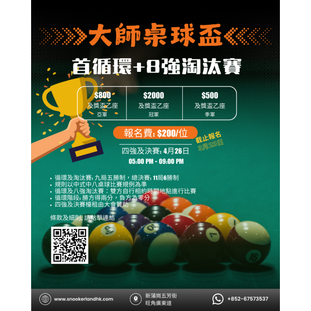 2026年度春季Snookerland 桌球天地大師盃比賽報名費