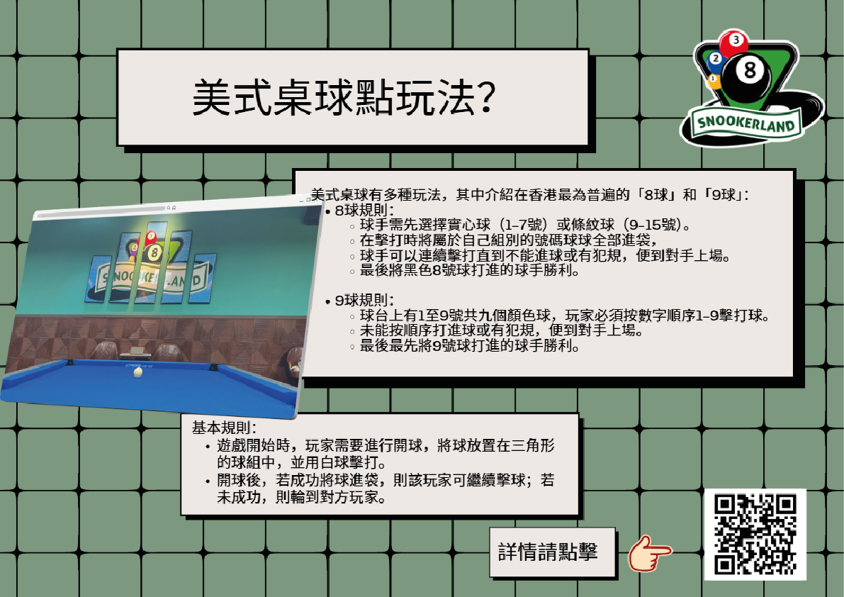 美式桌球有多種玩法,其中介紹在香港最為普遍的「8球」和「9球」: