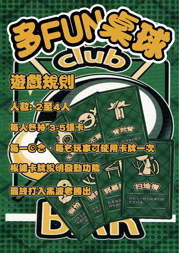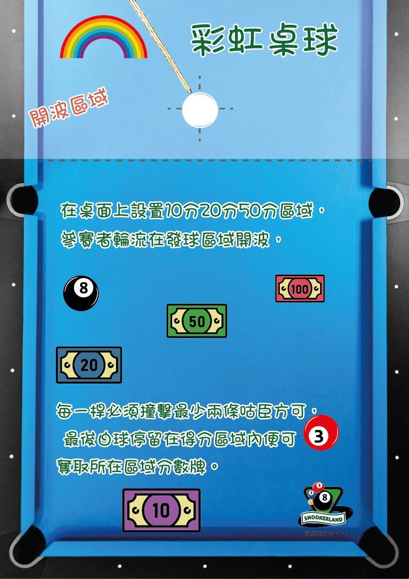 在桌面上設置10分20分50分區域,參賽者輪流在發球區域開波,每一桿必須撞擊最少兩條咕臣方可, 最後白球停留在得分區域內便可奪取所在區域分數牌。當所有分數牌都被取得之後,最後計算最高分數者勝出。*另可以設置一...