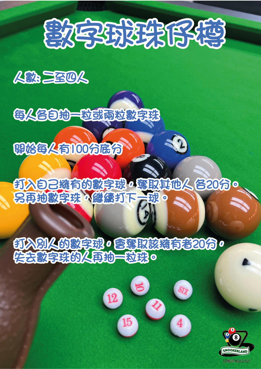 數字球珠仔樽人數二至四人每人各自抽一粒或兩粒數字珠開始每人有100分底分打入自己擁有的數字球,奪取其他人毎人各20分。另再抽數字珠,繼續打下一球。打入別人的數字球,會奪取該擁有者20分,失去數字珠的人再抽一...
