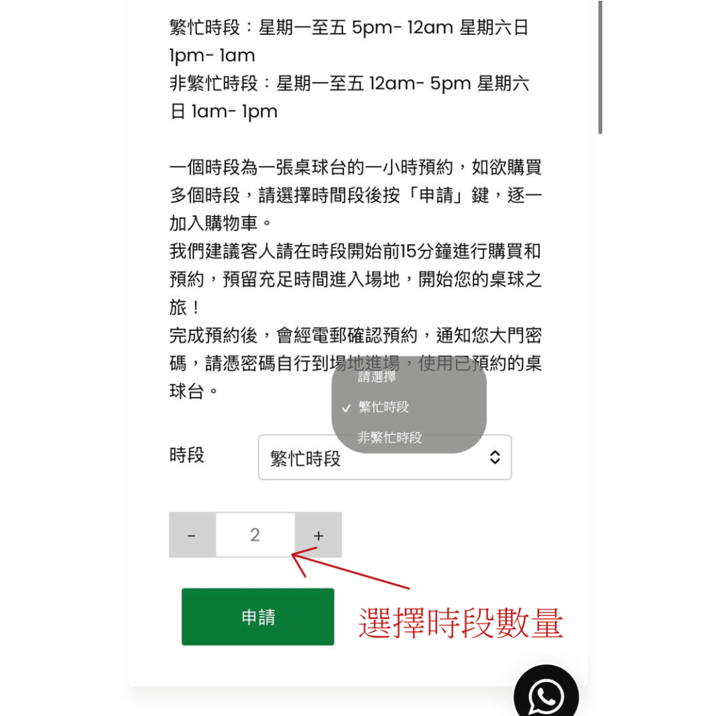 一個時段為一張桌球台的一小時預約,如欲購買多個時段,請選擇時間段後按「申請」鍵,逐一加入購物車。